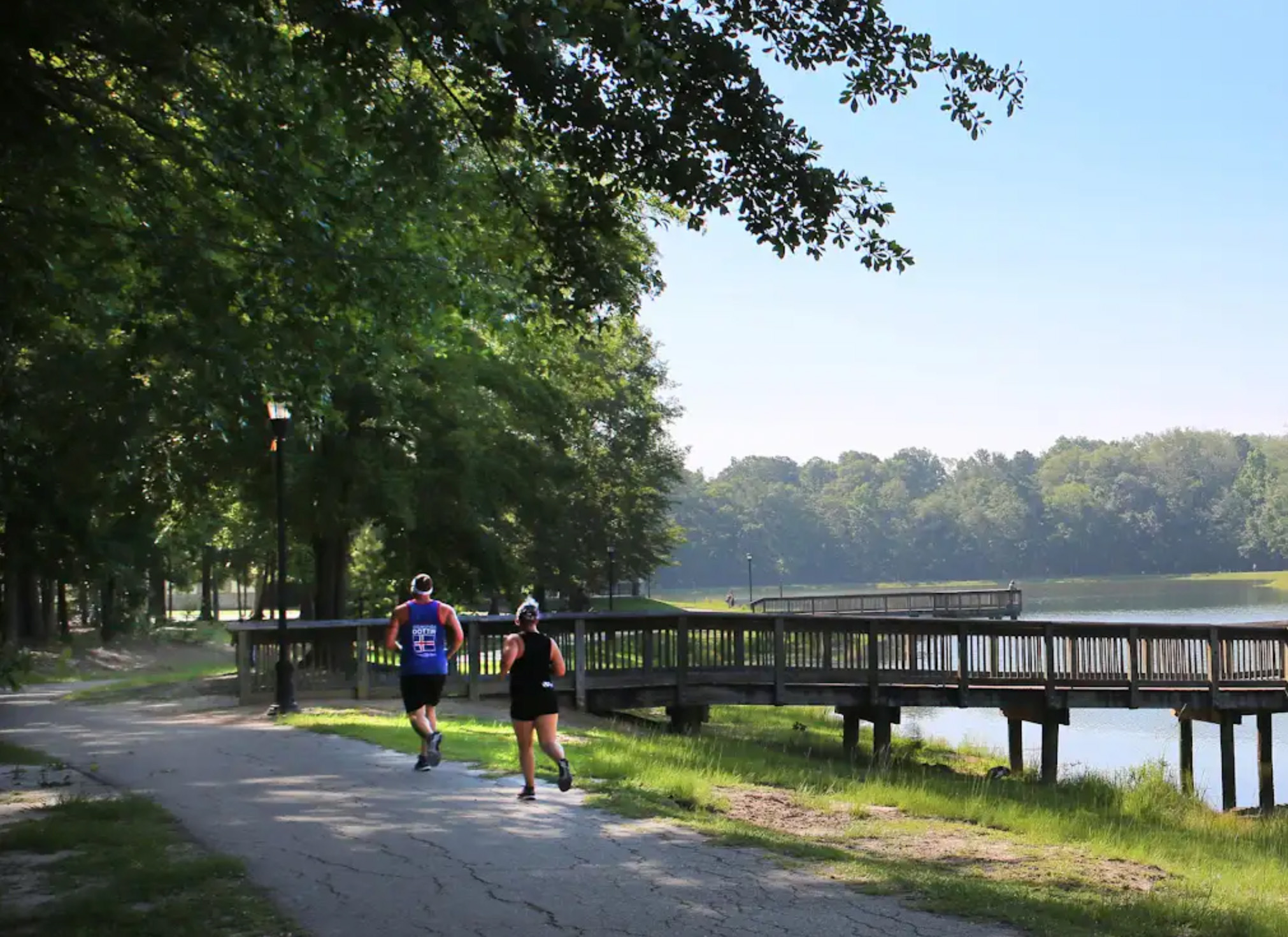 A spacious community park in Pooler featuring walking trails, a disc golf course, a scenic lake, and ample recreational space—perfect for picnics, exercise, and outdoor fun.